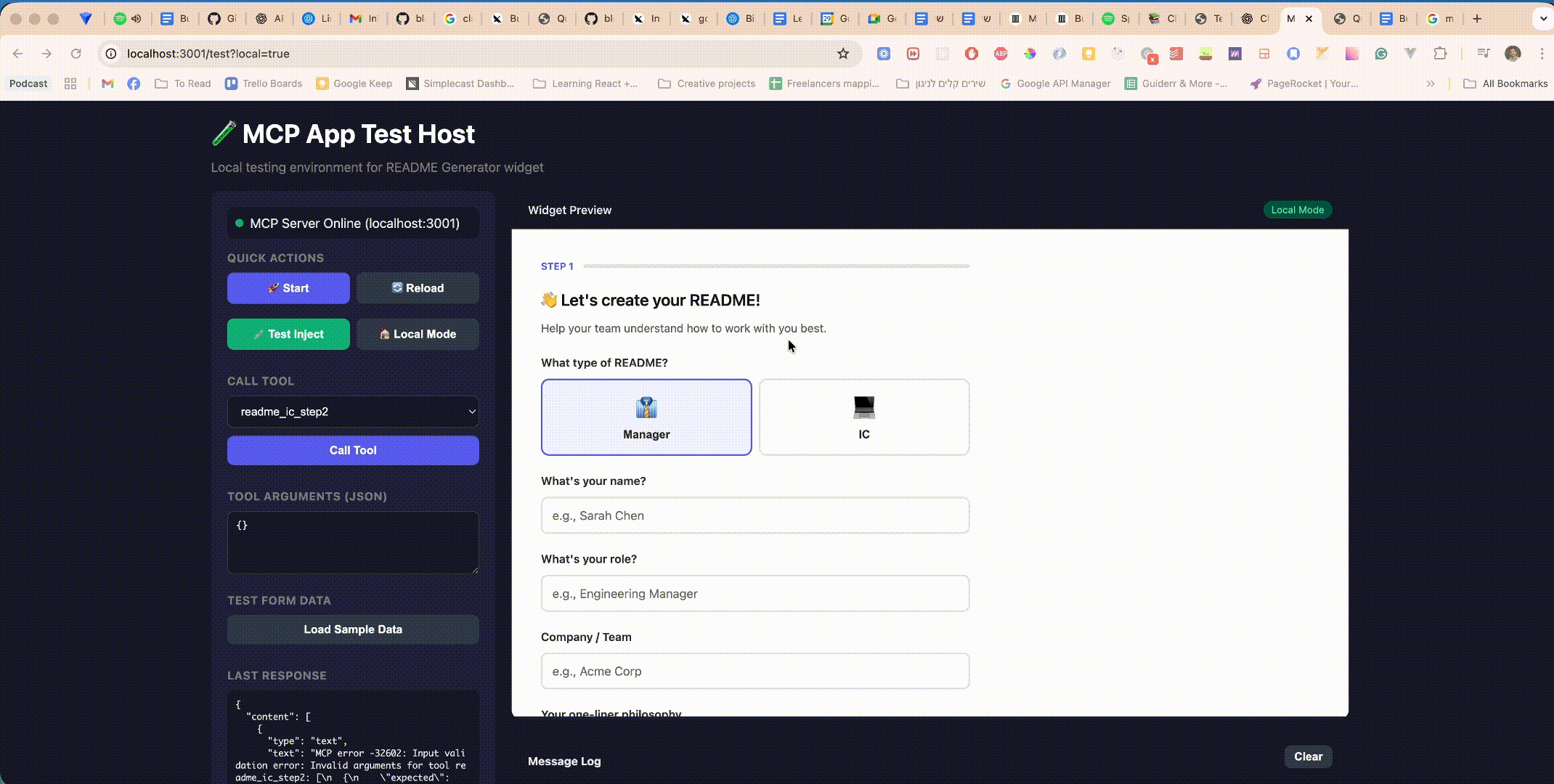 בניתי את ה-README Generator בעיקר כדרך להבין MCP Apps בפועל. החלק המעניין לא היה יצירת ה-README עצמו – זה פשוט. מה שרציתי לחקור היה: האם אפשר לקחת חוויית web קיימת ולהביא אותה לצ'אט בלי לשכפל את כל הלוגיקה?